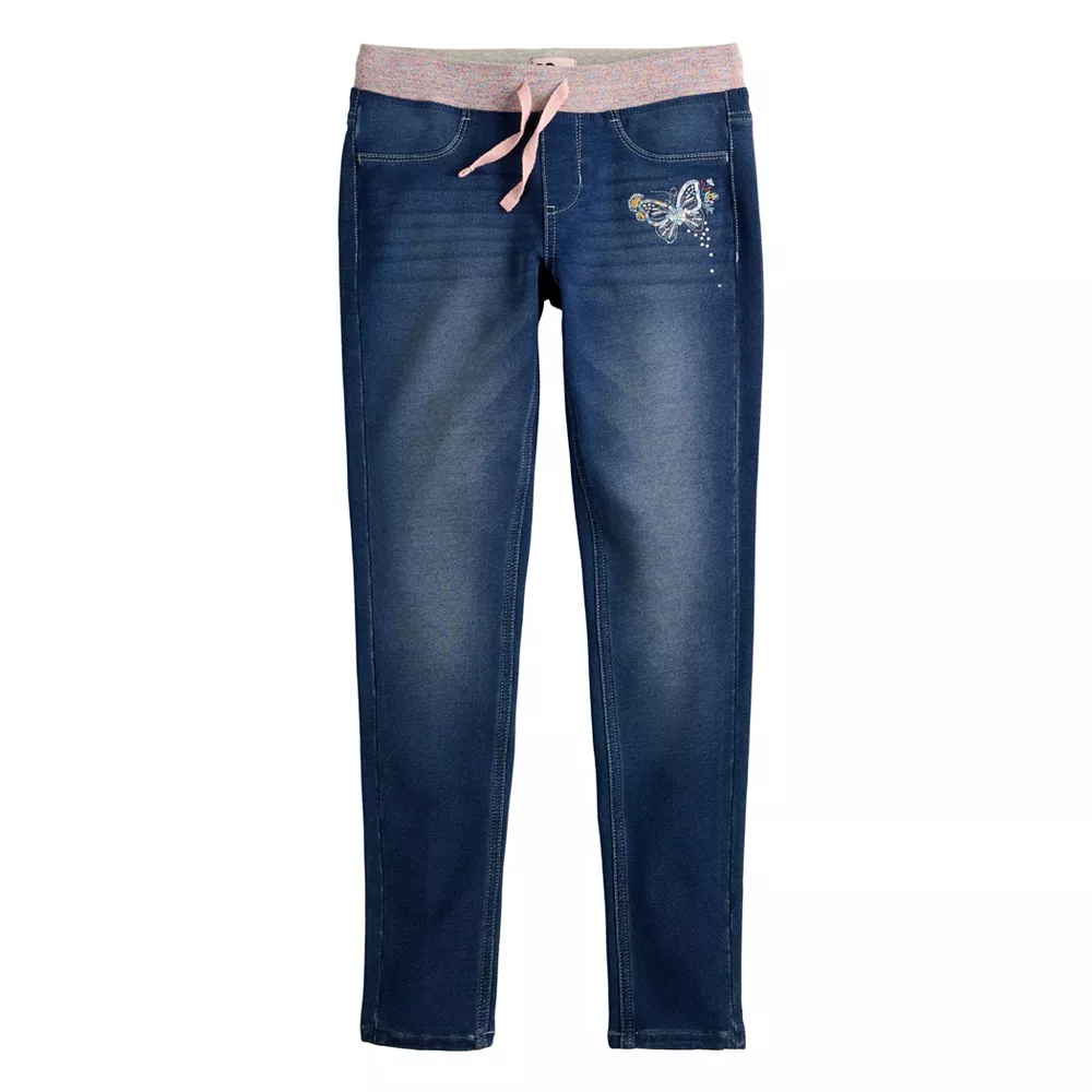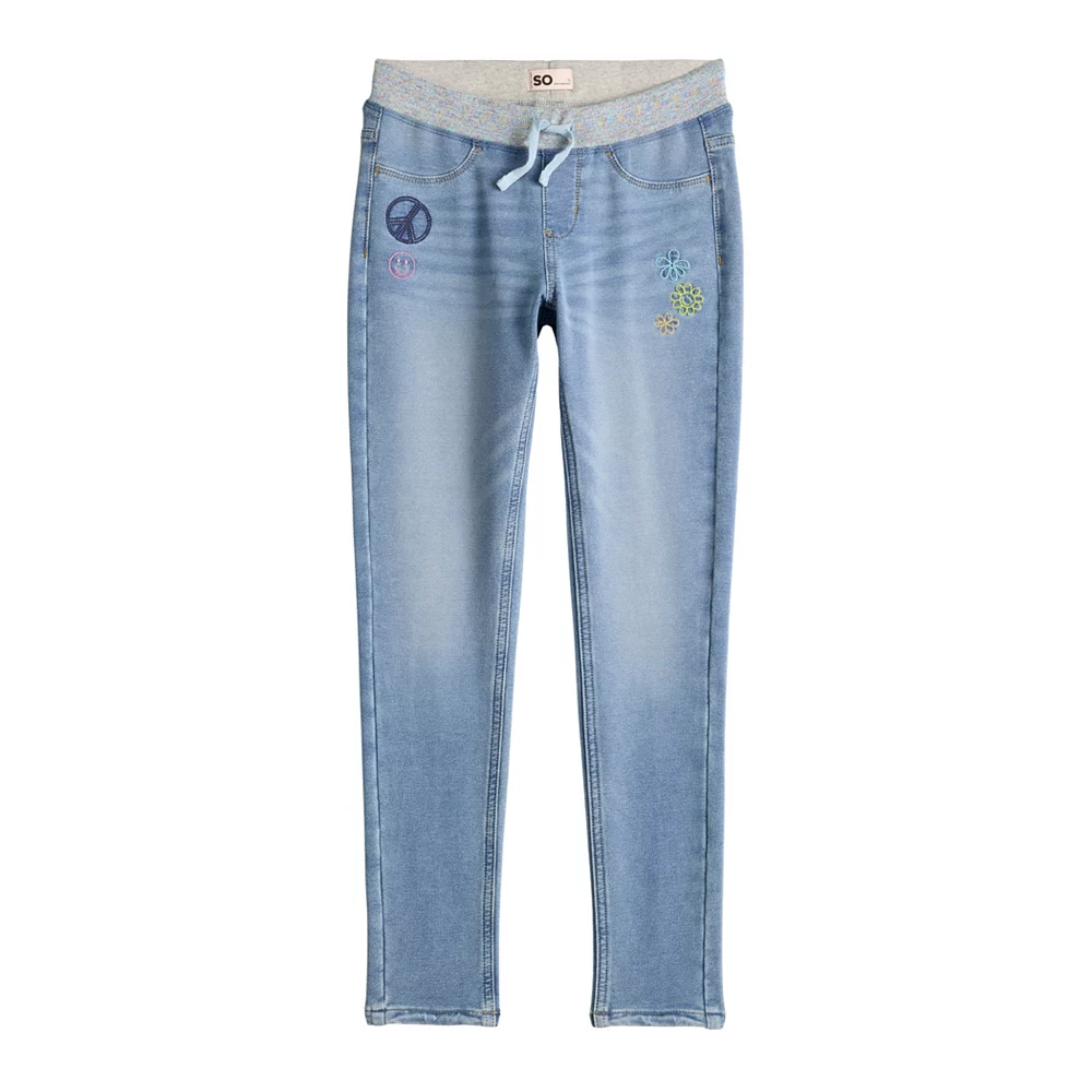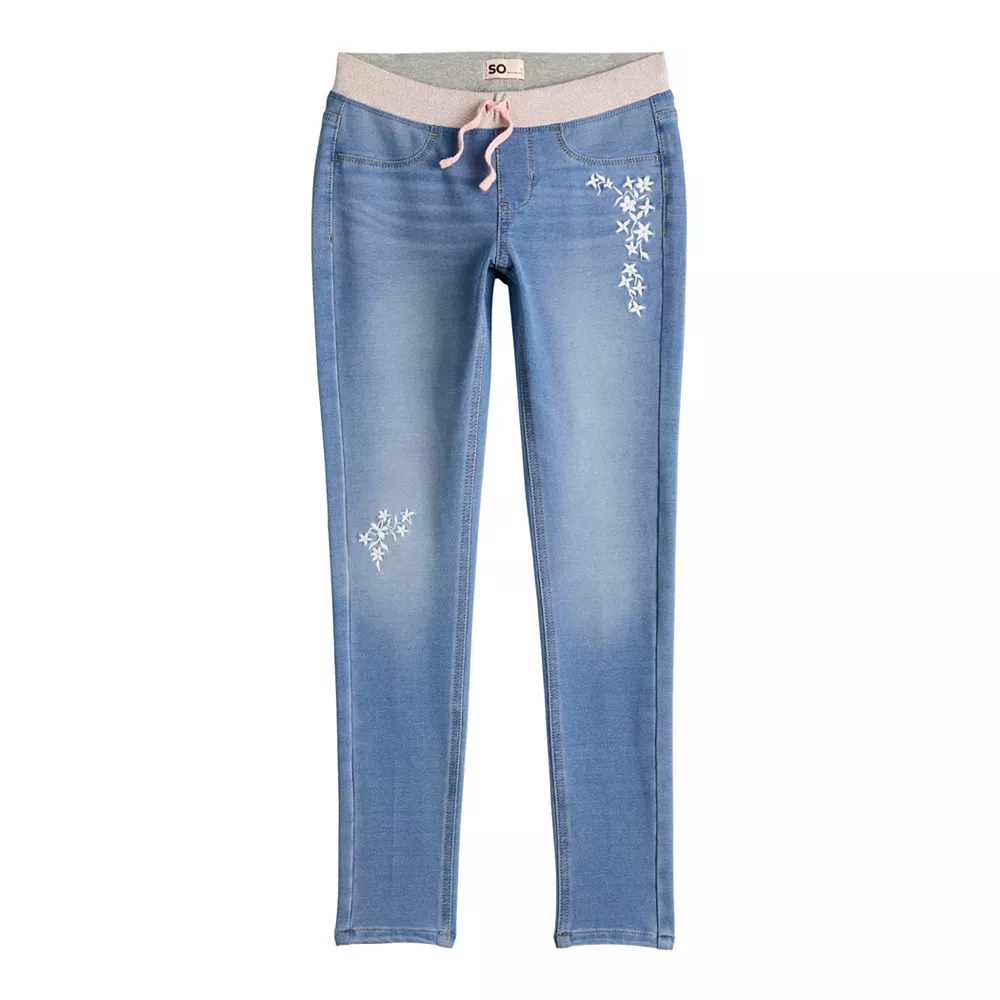 SO defines cute style and all-day comfort with these girls’ rib-waist skinny jeggings.