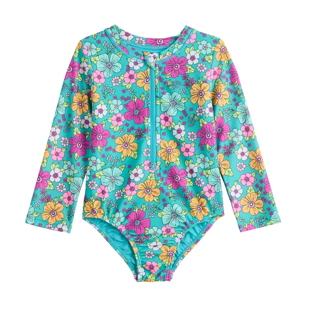 She’ll make a splash in this girls’ Jumping Beans one-piece rash guard.
