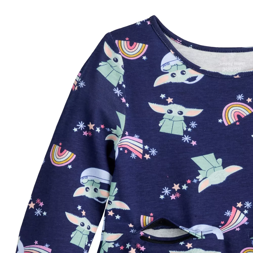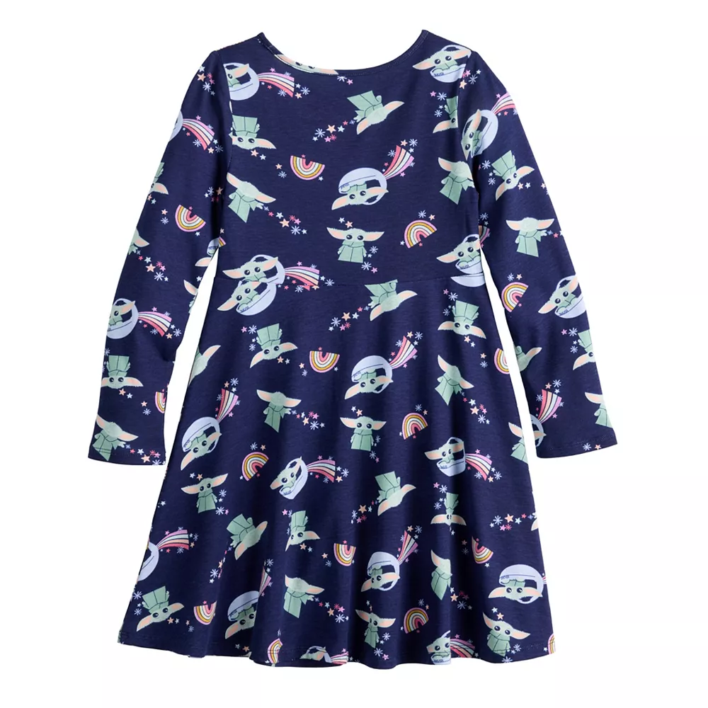 The Force will be with her in this toddler girls’ Grogu aka Baby Yoda allover print long sleeve skater dress from Jumping Beans.
